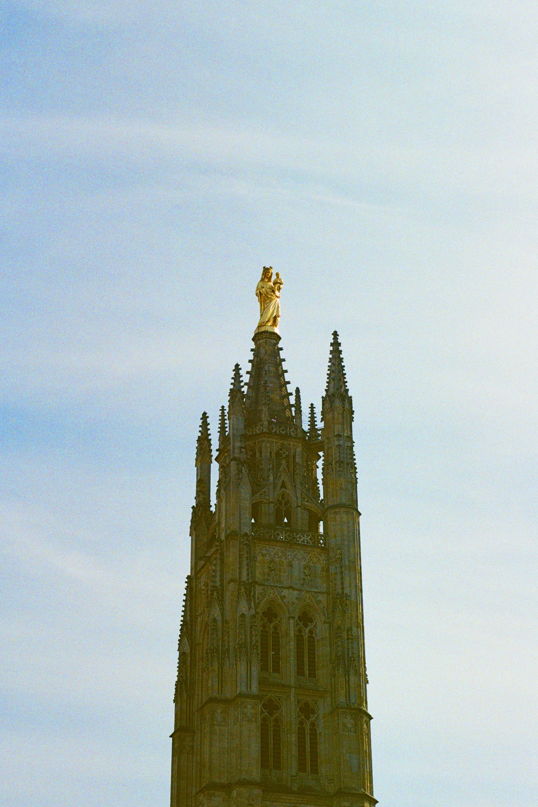 Un’imponente torre neogotica che si staglia contro un cielo limpido, illuminata dalla calda luce del tramonto. I dettagli architettonici e le sfumature dorate rendono questa fotografia un pezzo d’arte ideale per chi ama la bellezza delle grandi cattedrali europee.